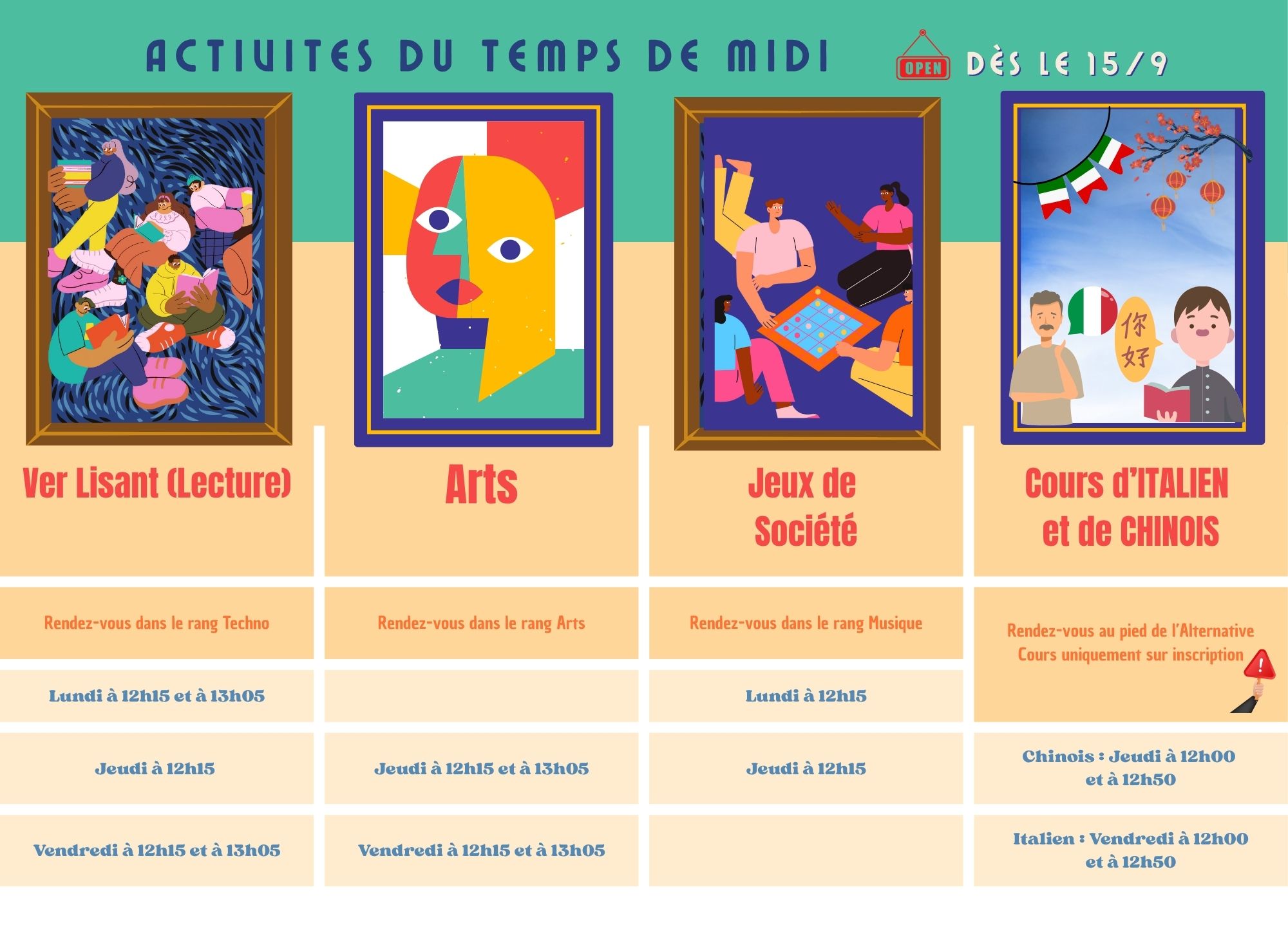 Nous avons le plaisir de vous informer que nos activités du temps de midi débutent ce lundi 15/9 selon l'horaire indiqué dans l'affiche ci-dessous.