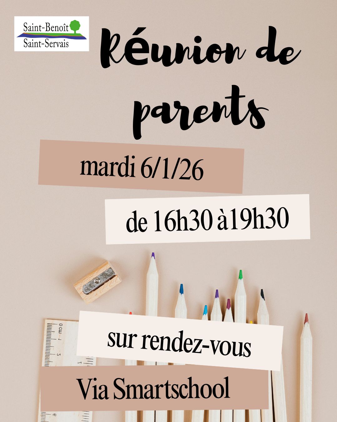 La réunion de parents se déroulera le mardi 6 janvier entre 16h30 et 19h30.