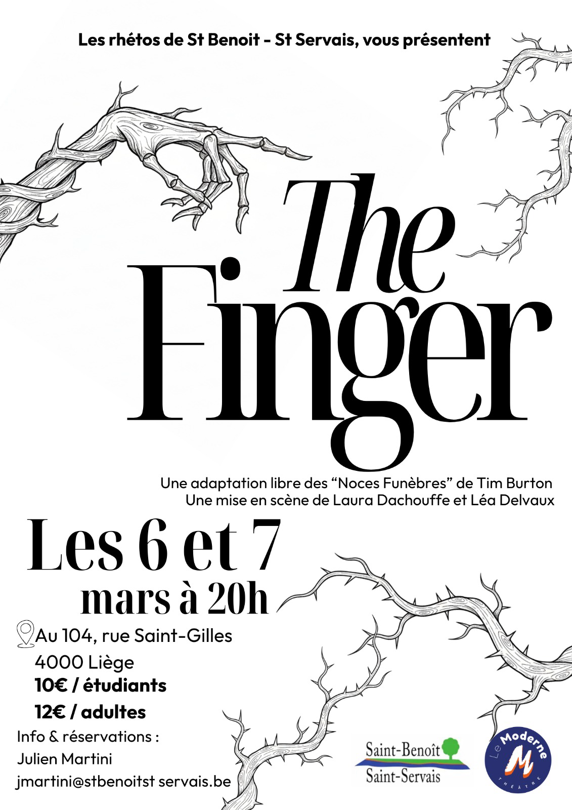 Les élèves de rhétorique ont le plaisir de vous inviter à leur pièce "The finger" les 6 et 7 mars 2026.