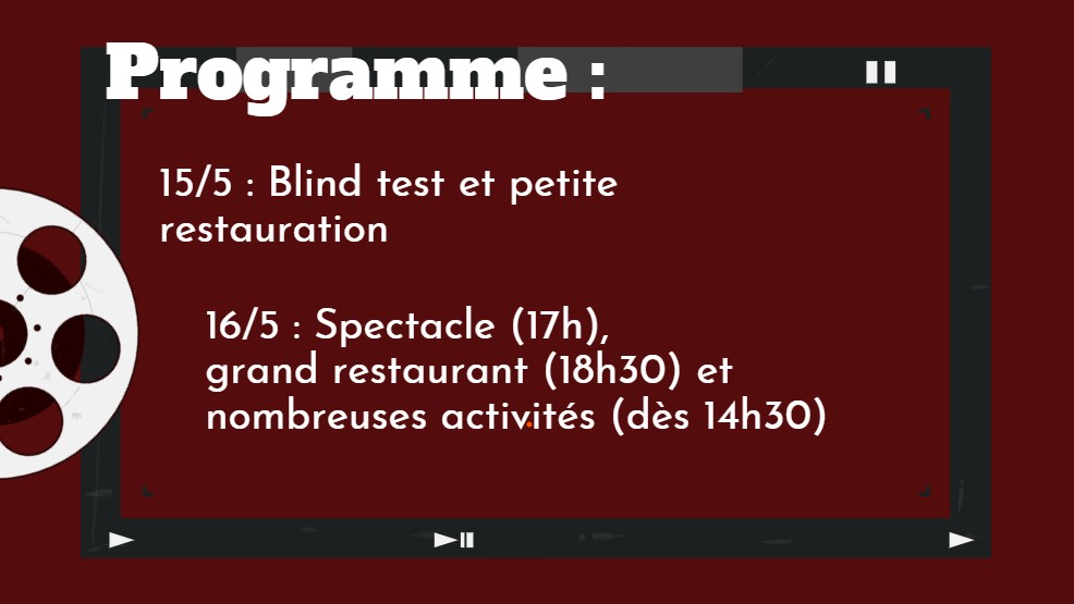 Nous avons le plaisir de vous inviter le vendredi 15/5 et samedi 16/5 pour notre fête de l'école sur le thème du cinéma ! Vous trouverez ci-dessous les premières infos du déroulement des 2 jours ! On espère vous voir nombreux !